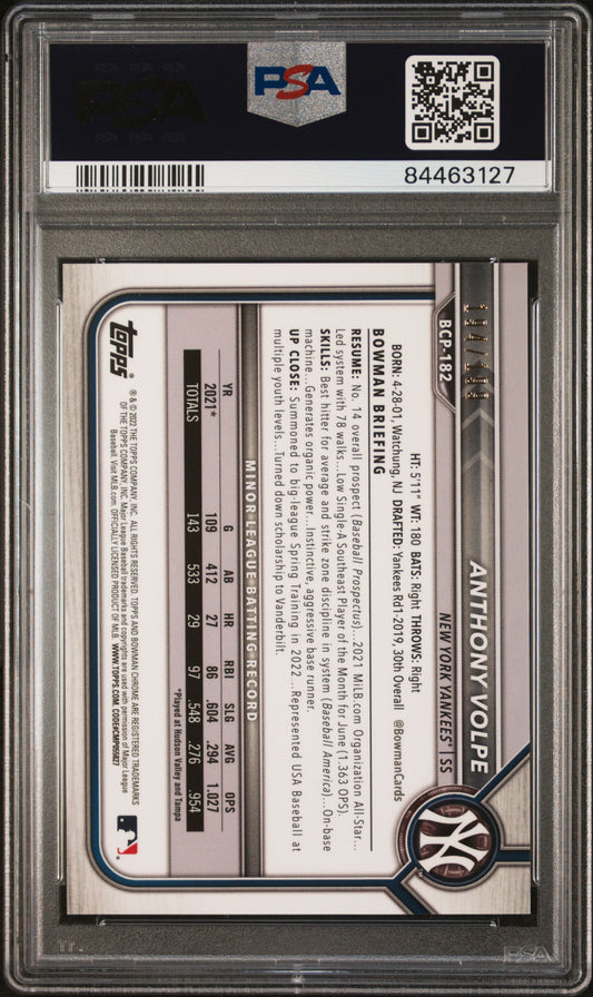 2022 Bowman Chrome Prospects #BCP182 Anthony Volpe 194/199 FCHS/Pink Vapor Ref. PSA 8 NM-MT