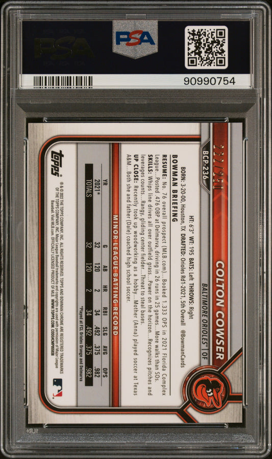 2022 Bowman Mega Box Chrome #236 Colton Cowser Purple Refractor PSA 8 NM-MT 222/250