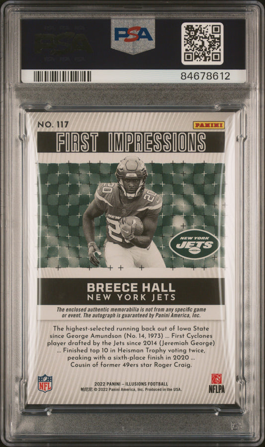 2022 Panini Illusions #117 Breece Hall Autograph Mem-Black Rookie Patch PSA 9 MINT Autograph 10 17/50